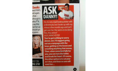 Dyer’s reply was published in the latest edition of lads’ weekly Zoo, published by Bauer Media, in reponse to a letter from a 23-year-old reader – “Alex, Manchester” – asking for advice on how to get over his split from his girlfriend.