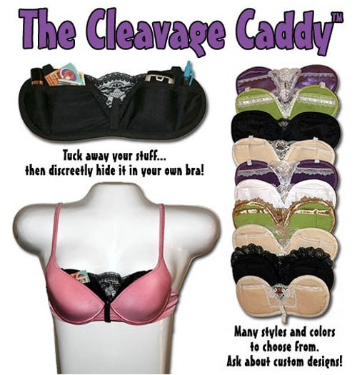While organizing Tuamdance over the weekend I had to carry around a lot of important stuff.  Envelopes of cash, my phone, chewing gum etc.  I was too busy to carry a handbag, so of course, I did what any large breasted woman would do.  I stored it all in my bra!  I know, I stayed classy San Diego.  However, lots of girls don’t have as much storage space in there as I do (and by the way, I’m not bragging about this…I pay for my boobs with a ginormous ass), but they need worry no longer!  The cleavage caddy is here!