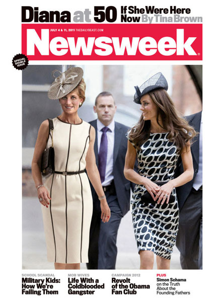 Well, it’s not in God’s name, it’s in the name of magazine sales of course. The late Princess Diana would have turned 50 this Friday, so Newsweek thought it was only appropriate to power up the photoshopper and create this fantastical photo of what it would be like “if she were here”.