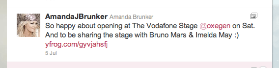 As you know at this point, Oxegen (“Europe’s Greatest Music Festival”) is happening this weekend in Punchestown. There are some brilliant acts playing, from huge pop stars like Beyonce to hot new things like Odd Future, and of course, Amanda Brunker. Who? Amanda Brunker. Yes. Champagne Babes writing, Sunday World journalizing, couch selling Amanda Brunker. She’ll be on the second biggest stage (The Vodafone Stage) on Saturday afternoon filling the stilettos of Jessie J. Confused? Me too.