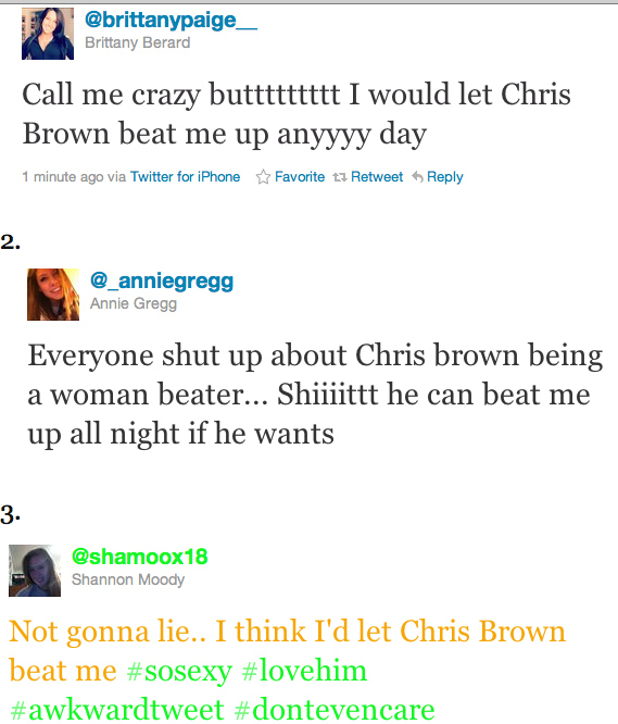 Those are just a few, there are loads more, loads of young women who think that having someone beat you up is an acceptable price to pay for having a famous and attractive boyfriend. By glorifying him, society is sending a message to those young women that what he did really wasn’t all that bad. Society is sending a message to young men that it really isn’t the worst if you lose your temper and hit your girlfriend. People will get over it.